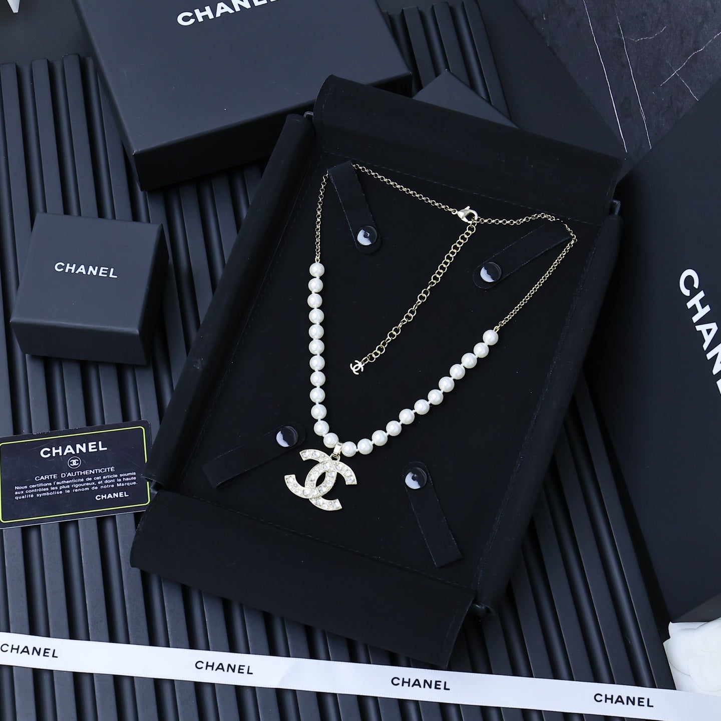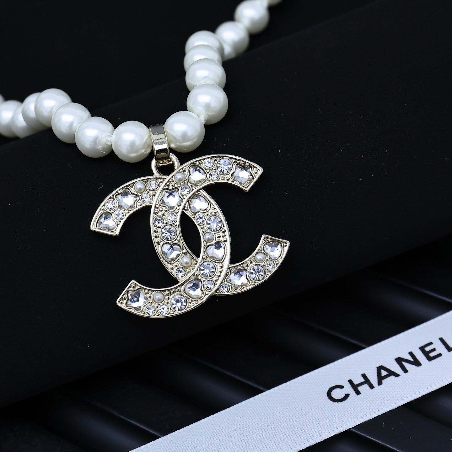 25P PEARL NECKLACE IN LIGHT GOLD STAR & HEART DOUBLE C PENDANT